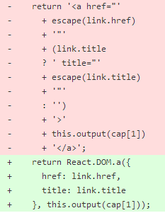 Sophie Alpert converted marked, a Markdown JavaScript implementation, in React: marked-react. Even without using JSX, the HTML generation is now a lot cleaner. It is also safer as forgetting a call to escape will not introduce an XSS vulnerability.