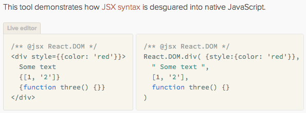 Ever wanted to have a quick way to see what a JSX tag would be converted to? Tim Yung made a page for it.