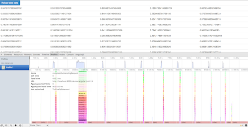 Rendering this takes 803ms for 10 iterations, hovering around 35 and 55ms for each data reload (that’s 67% faster). You’ll notice that the first load takes a little longer than successive loads, and the second load REALLY struggles - here, it’s 433ms, which is more than half of the total time!