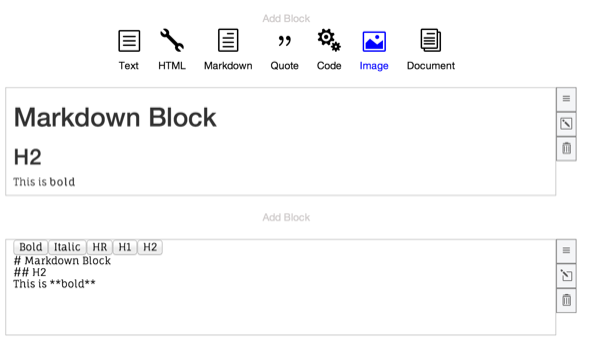 John Lynch (@johnrlynch) created Makona, a block-style document editor for the web. Blocks of different content types comprise documents, authored using plain markup. At the switch of a toggle, block contents are then rendered on the page. While not quite a WYSIWYG editor, Makona uses plain textareas for input. This makes it compatible with a wider range of platforms than traditional rich text editors.