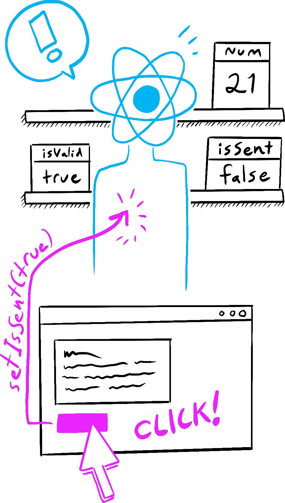 onSubmitevent handler executes. setIsSent(true)setsisSenttotrueand queues a new render.- React re-renders the component according to the new