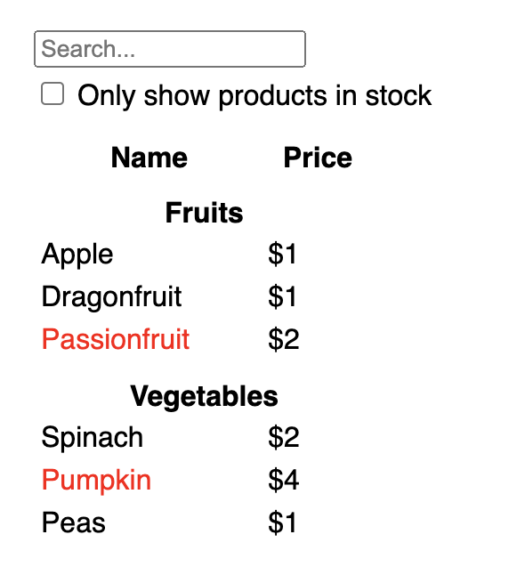 ProductTableneeds to filter the product list based on that state (search text and checkbox value).SearchBarneeds to display that state (search text and checkbox value).